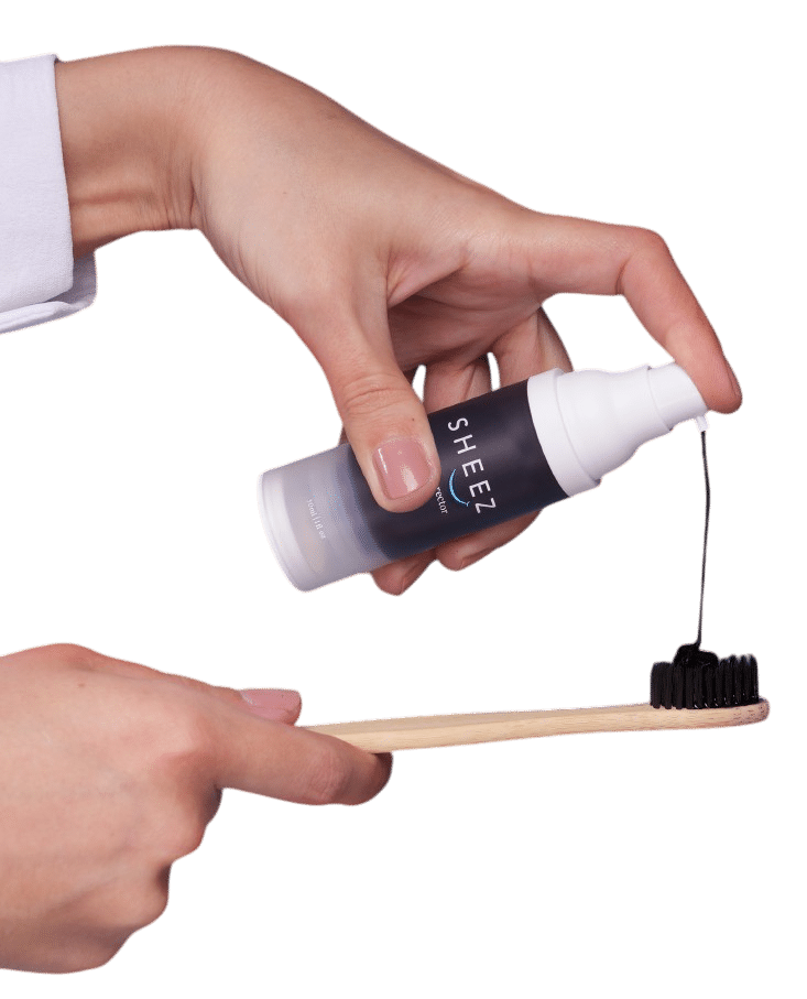 ١ـ ضع كمية صغيرة من سيروم مبيض الأسنان على فرشاة اسنان متوسطة الخشونة